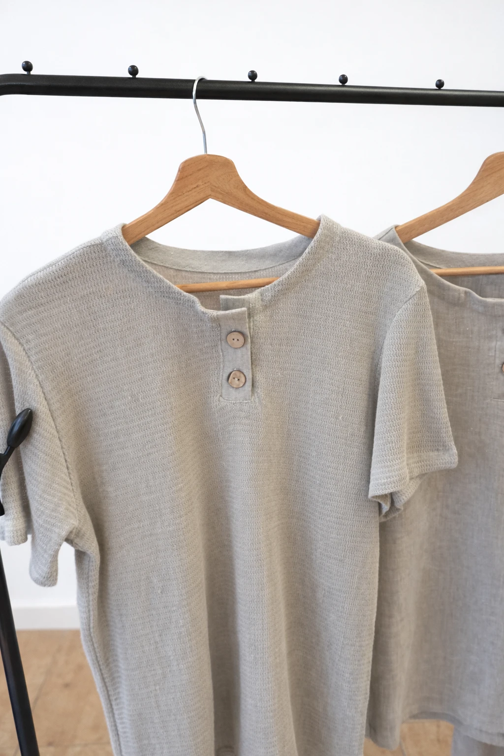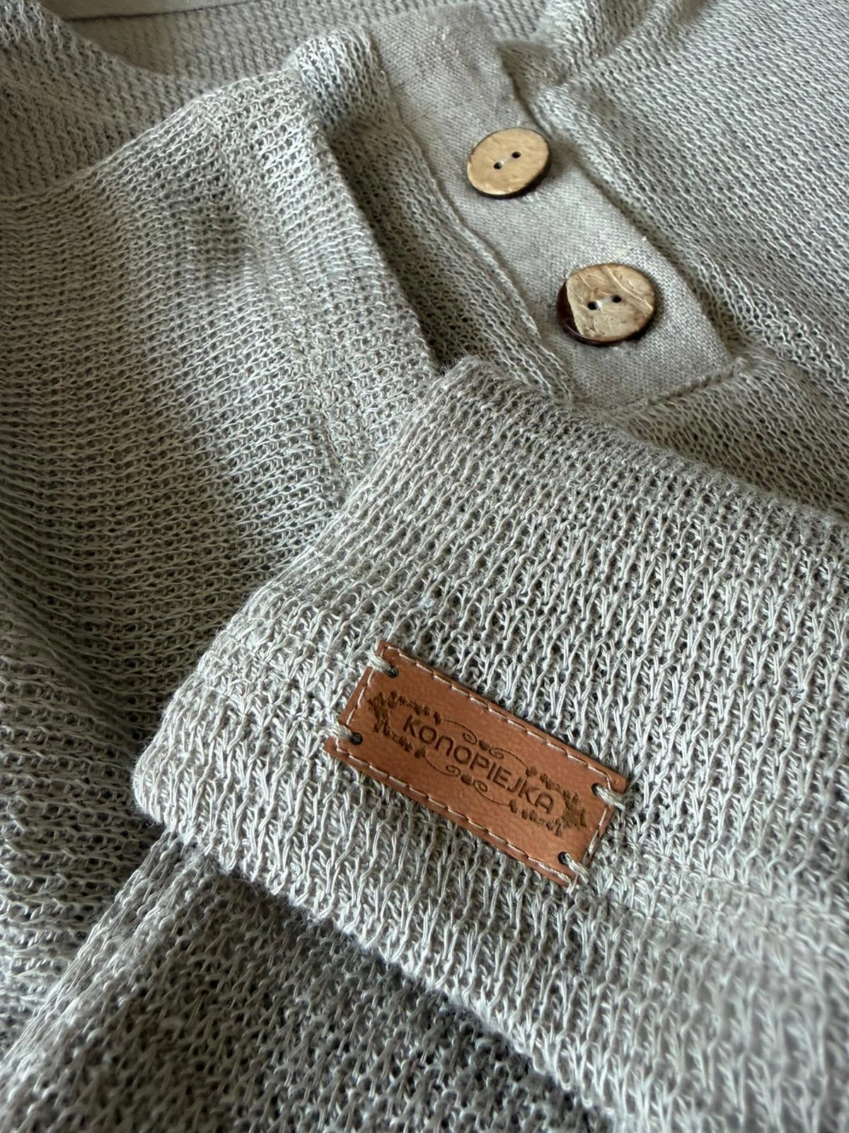Model posiada zapięcie na guziki, które nadaje mu subtelnie bardziej wyrazistego charakteru. Dodatki z naturalnej lnianej tkaniny oraz drewniane guziki podkreślają jego autentyczność i minimalistyczny styl inspirowany naturą.